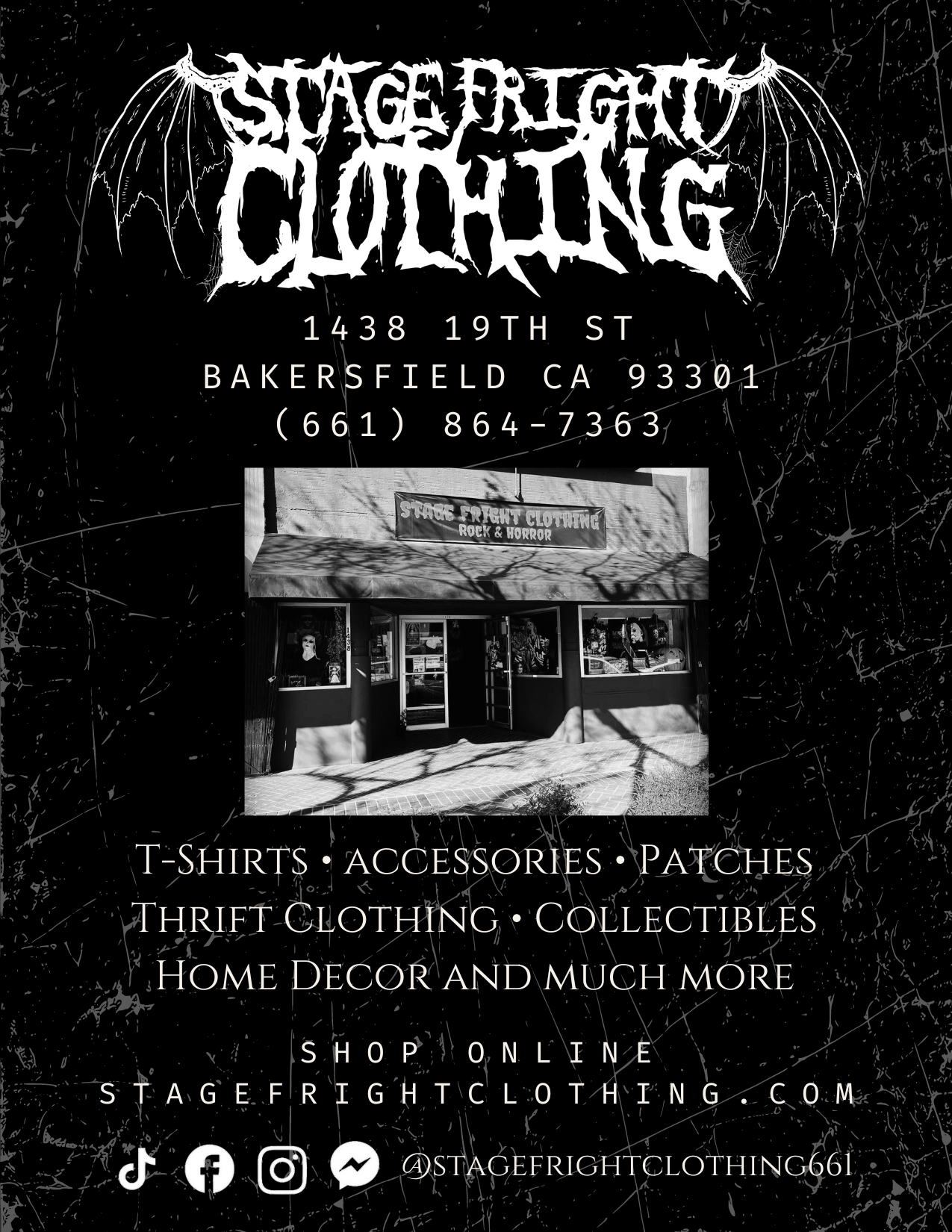 Stage Fright Clothingis a small, locally-owned Mexican American business run by the husband-and-wife duo, Sal and Lorena. As passionate fans of rock music and horror movies, we strive to bring you unique merch from the bands and films you love! The name itself reflects our brand’s essence: "Stage" represents our band merchandise, inspired by the energy of rock and metal, while "Fright" embodies our horror-themed designs, drawing from the spine-chilling thrill of iconic movies. "Clothing" ties it all together, offering bold, edgy apparel that lets you showcase your love for both music and horror. What started as a dream at our local swap meet has grown into a year-round, standalone brick-and-mortar store. We’ve also curated many local events for our alternative community, striving to create a safe space for everyone. Located in the heart of downtown Bakersfield, we invite you to stop by the shop, say a spooky greeting, and get lost in our maze of alternative goods—just beware, you might end up cursed! Remember to always stay spooky. 🦇