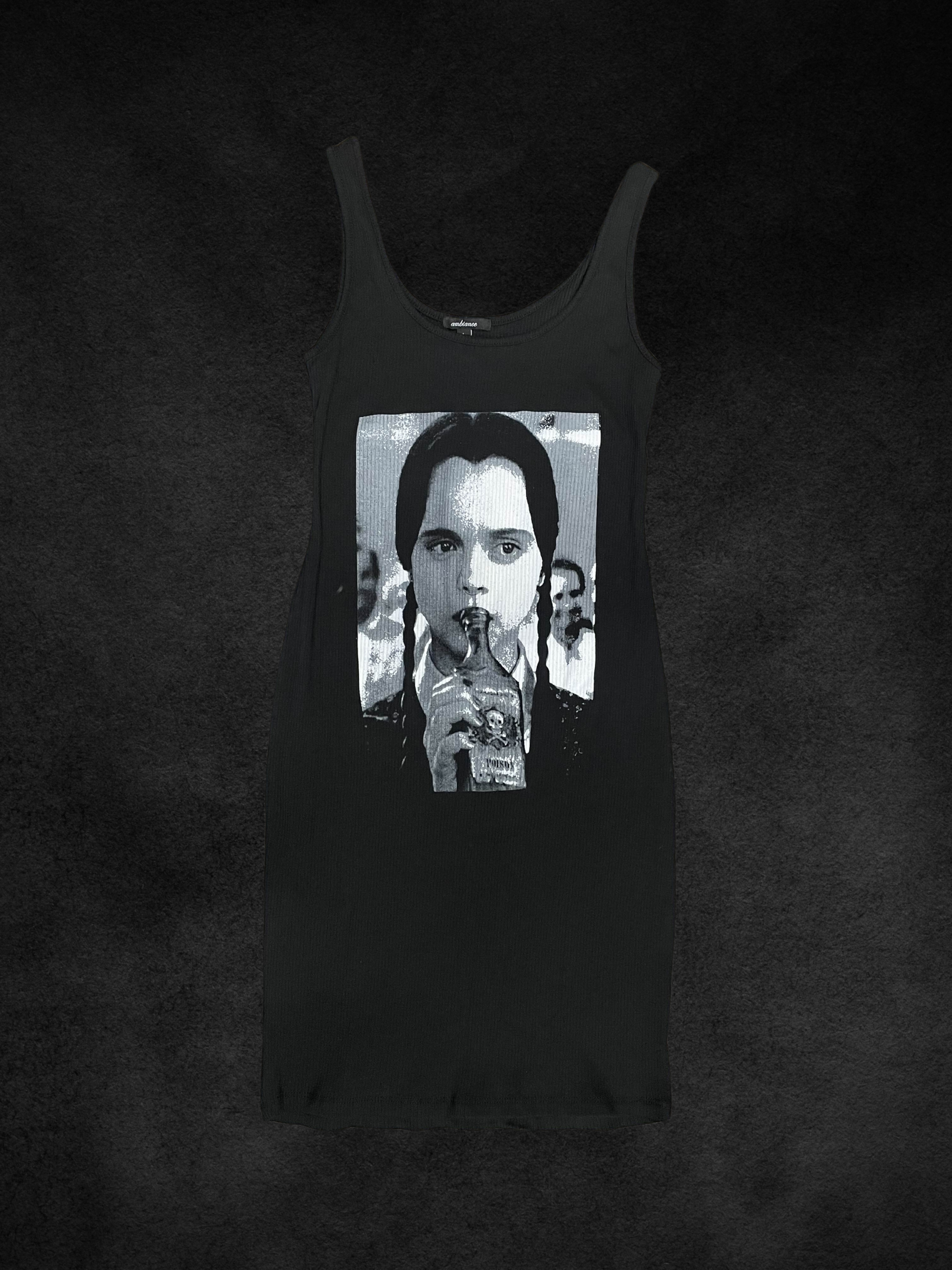 The scoop neckline adds a subtle touch of femininity, while the all-black design stays true to Wednesday’s hauntingly cool aesthetic. Whether you're heading to a spooky soirée or just embracing your inner Addams, this dress delivers timeless dark elegance.
